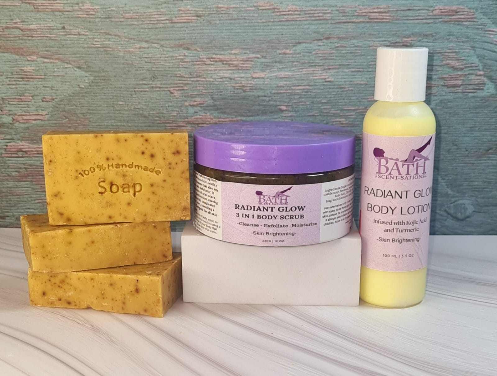 Achieve a flawless, radiant complexion with our Radiant Glow Package, a powerful 5-piece skincare set designed to reveal your skin's natural brilliance. Infused with the brightening and skin-loving properties of Kojic Acid and Turmeric, this set is perfect for those seeking a visibly even tone, smoother texture, and a lit-from-within glow.